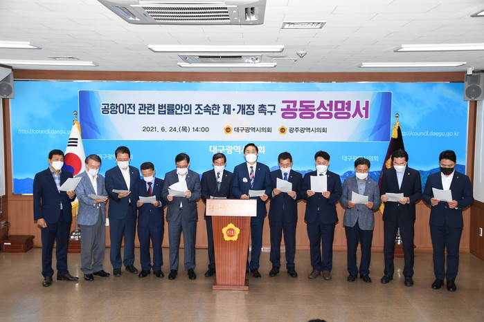 이번 성명서는 그간 광주시와 대구시가 군공항을 겸하는 기존 민간 공항을 타 지역으로 확장 이전하는 사업추진 일환으로 「군공항이전 특별법 개정」, 「대구경북신공항 특별법 제정」을 촉구하였지만, 지난 2월 임시국회에서 상임위원회 문턱조차 넘지 못하는 등 여전히 지지부진한 상황에서 타개책을 마련하기 위함이다.