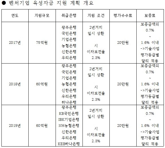 벤처기업 육성 자금은 「벤처기업 육성에 관한 특별조치법」에 의한 지역 소재 벤처기업과 창업 5년 이내 광(光) 관련 기업에 시설 자금 3억원, 운전자금 2억원 등 업체당 총 5억원을 지원하며 광주광역시와 경제고용진흥원은 2.3%의 이차보전을 통해 저금리로 융자하고 있다고 밝히고 있는 정책 자금이다.
