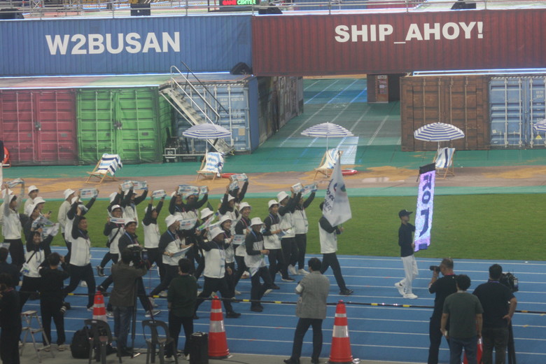 ▲경기도선수단이 부산아시아드경기장에 입장하고 있다. |