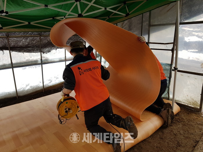 이날 봉사에는 나눔봉사단 유희자 단장, 산악회 김호현 회장, 운영위원회 박영준 회장을 비롯해서 회원 20명이 추운날씨에도 바닥정리와 파래트 설치 후 2중 장판을 깔은 후에 전기장판 및 겨울이불과 천막으로 마무리를 하면서 사회적 효행을 실천 하였다.
