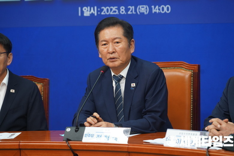 '정청래' 더불어민주당 당 대표가 21일 오후 서울 여의도 국회에서 열린 호남발전특별위원회 출범식에서 발언을 하고 있다.