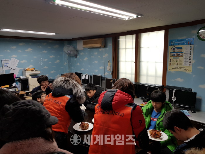 전대진 원장은 “며칠 전부터 아이들이 통닭을 기다렸는데 사랑의 사다리 밴드에서 추운날씨에도 나오셔서 통닭을 해주셔서 큰 힘이 된다.“면서 감사함을 전했다.