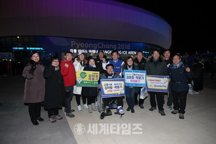 20일 강릉아이스아레나에서 열린 김아랑 선수 경기에 고양시가 응원에 나섰다. 김아랑 선수는 고양시청 소속. 지난 달 9일 입단했다. 이날 김아랑 선수가 속한 쇼트트랙 여자 대표팀은 3,000m 계주 결승에서 가장 먼저 결승선을 통과하며 응원에 보답했다.