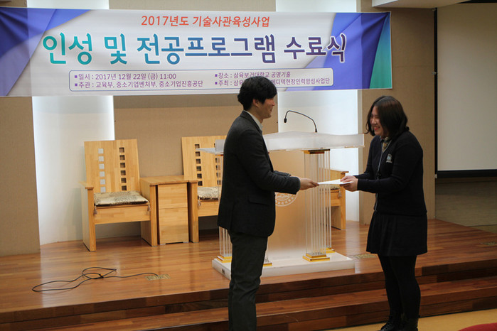 [세계타임즈 이채봉 기자]삼육보건대학교(총장 박두한) 기술사관육성사업 메디텍현장인력양성사업단은 지난 12월 22일 소강당(공명기 홀)에서 인성 및 전공프로그램 수료식을 거행했다. 삼육보건대학 의료정보과에서 주최하고 교육부, 중소기업청, 중소기업진흥공단이 주관하는 이번 수료식은 박용민 사업단장과 37명의 수료자가 참석했다.