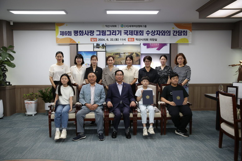 [익산=세계타임즈 이정술 기자] 익산시의회(의장 최종오)는 22일 오전 의장실에서 익산시장애인연합회(회장 정병현)와 IWPG 세계여성평화그룹(지부장 전영선)이 개최한 '제6회 평화사랑 그림그리기 국제대회' 수상자와 간담회를 가졌다.