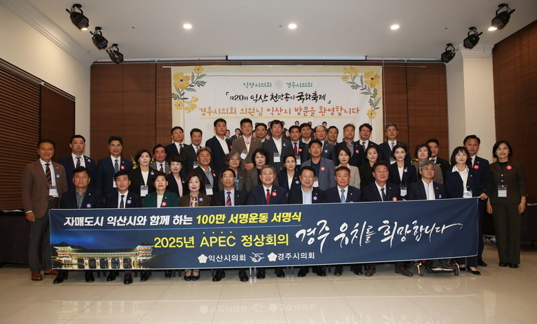 이날 열린 간담회에서는 상호 간 유대강화와 협력증진을 통해 지역과 지방의회 발전에 기여할 수 있는 구체적인 방안을 함께 모색했으며, 익산시의회 의원들이 ‘2025 APEC 경주 유치 100만인 서명운동’에 동참하며 경주 유치를 적극 지지했다.