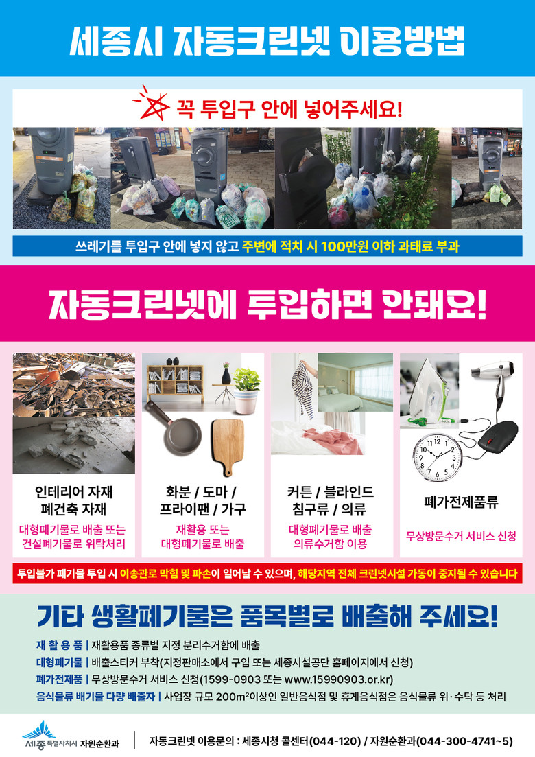 시는 이들 공동주택과 상가를 대상으로 ▲대형폐기물의 자동크린넷 투입 ▲종량제봉투 미사용 ▲재활용 가능 자원의 혼합배출 등 폐기물관리법 위반 사항을 집중적으로 단속한다.