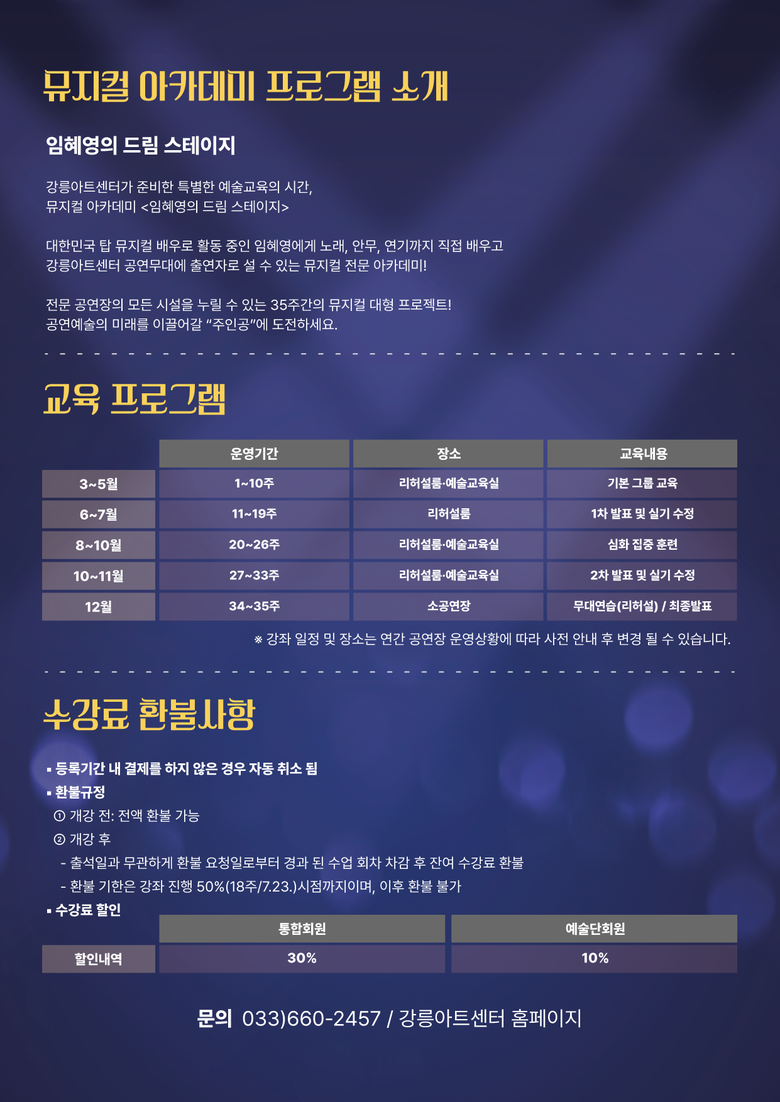 한편 강릉아트센터 뮤지컬 아카데미는 사전 오디션에 합격한 수강생을 대상으로 유료로 운영되며 프로그램 신청 및 자세한 사항은 강릉아트센터 홈페이지(gn.go.kr/artscenter/)를 참고하면 된다.
