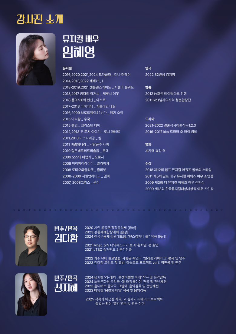 프로그램은 매주 화·수요일 그룹별 강습으로 실시되며, 노래 발성부터 안무와 연기까지 뮤지컬 배우 임혜영이 직접 모든 교육을 이끌어 간다.