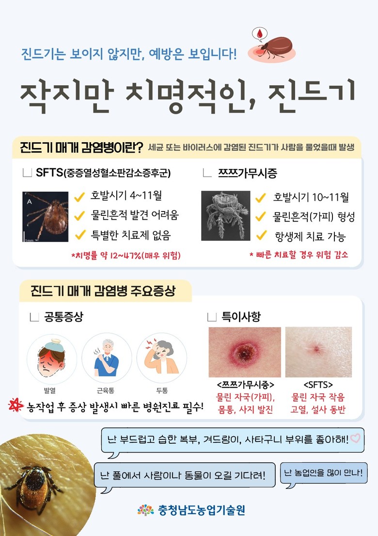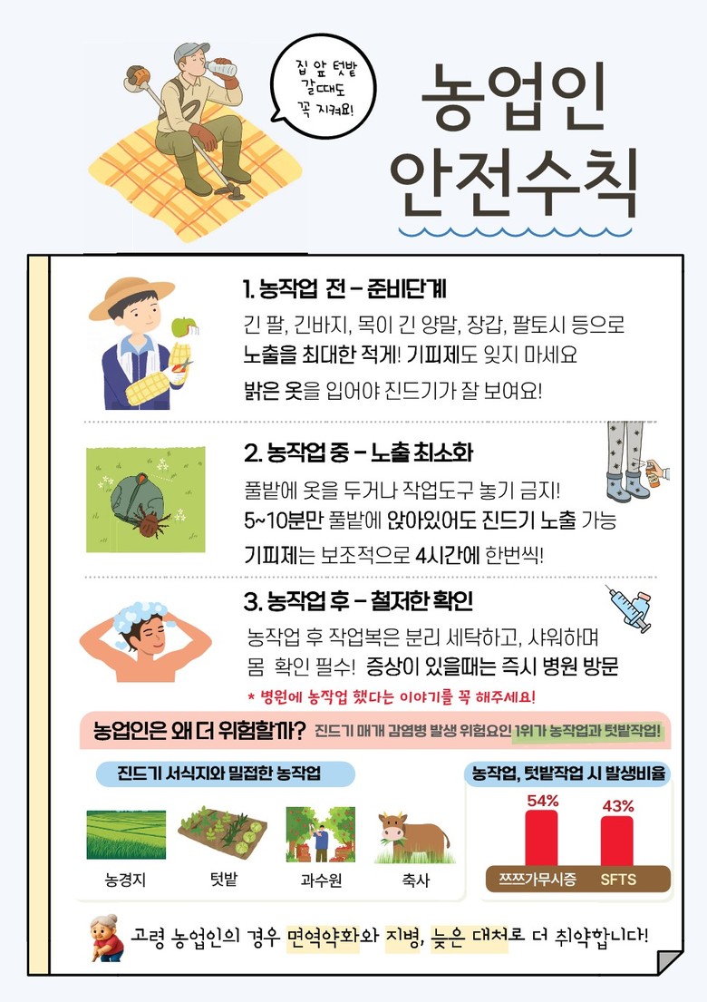 서동철 농촌자원과장은 “예방수칙만 철저히 지켜도 충분히 막을 수 있는 질환”이라며 “농작업 시 반드시 예방수칙을 준수하고, 집 앞 텃밭처럼 가까운 장소에서도 방심하지 않는 것이 무엇보다 중요하다”고 강조했다.