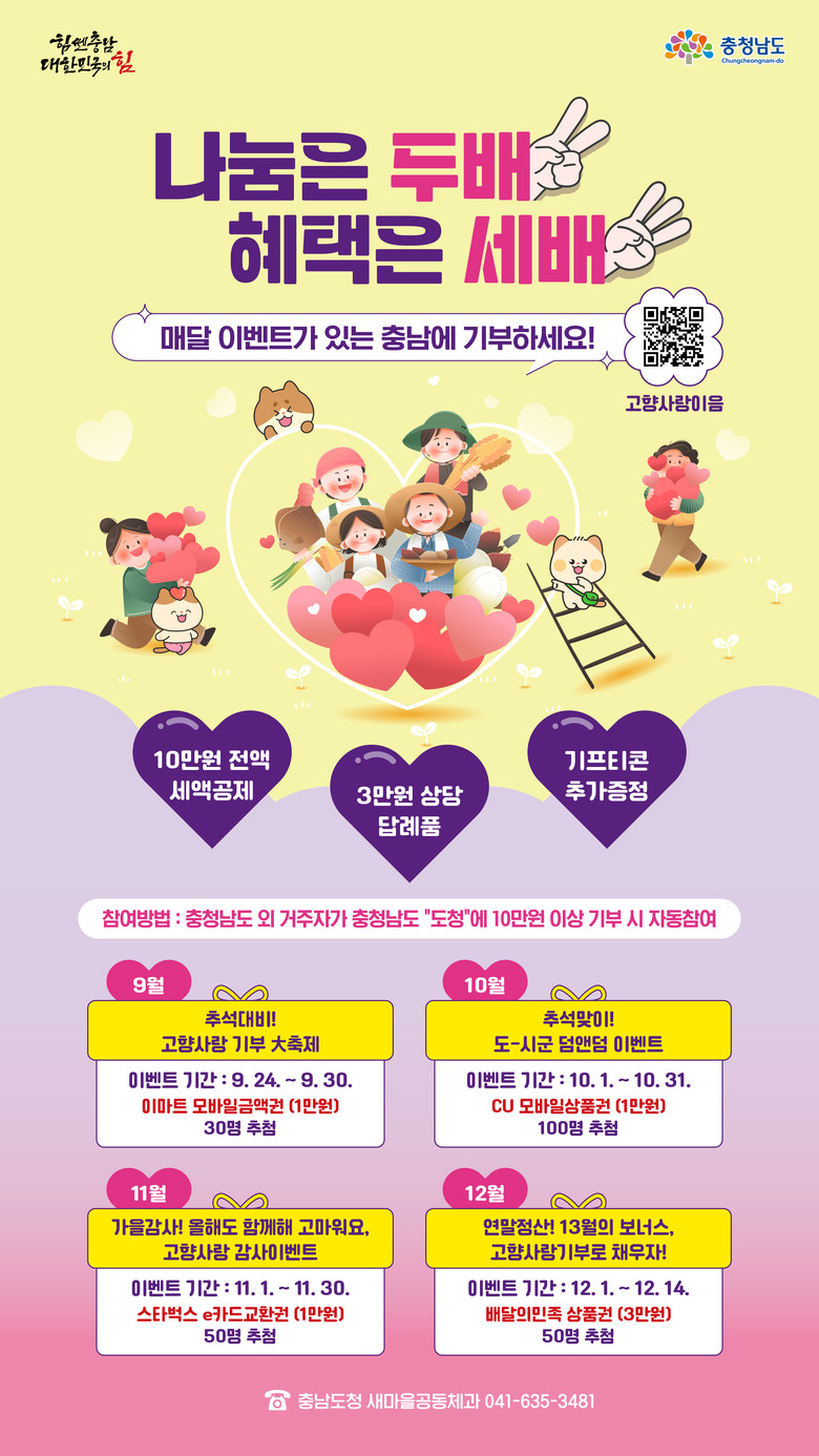 이번 이벤트는 오는 24일부터 12월 14일까지 매월 1차례씩 4회 진행하며, 매월 이벤트 기간 중 도청에 10만원 이상 기부 시 자동으로 참여하는 방식이다.