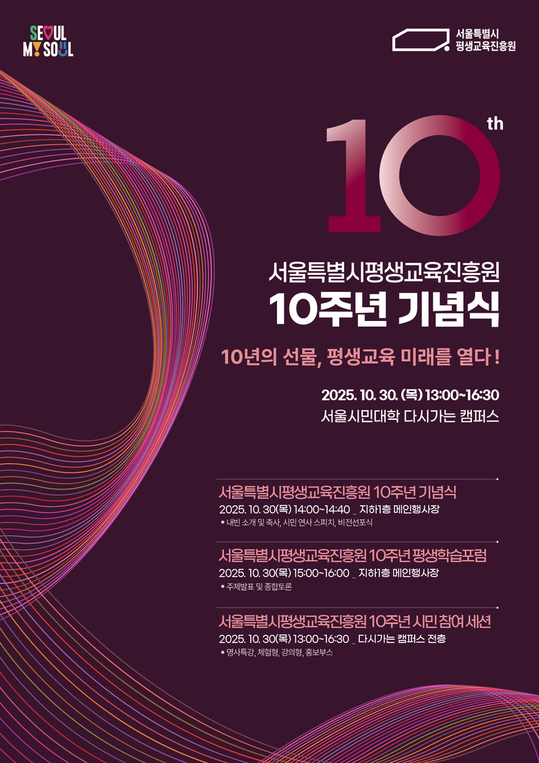 - 10월 13일(월) 서울시평생교육진흥원 10주년 기념 홈페이지서 선착순 300명 참여자 모집 [서울 세계타임즈=이장성 기자] 서울시평생교육진흥원(원장 한용진)이 설립 10주년을 맞아 오는 10월 30일(목) 서울시민대학 다시가는 캠퍼스에서 「서울시평생교육진흥원 10주년 기념식」을 개최한다. 이번 행사는 지난 10년의 성과를 되짚고 미래 비전을 제시하는 자리를 넘어, 시민이 직접 참여하고 즐기는 다채로운 축제의 장으로 마련된다.