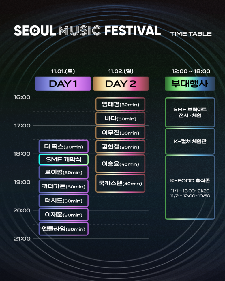 - 브릭아트 체험 및 전시, K-뷰티‧K-푸드 체험존, 캘리그라피 등 다양한 부대행 [서울 세계타임즈=이장성 기자] 서울시 대표 음악축제 <2025 서울뮤직페스티벌>이 11월 1일(토)부터 11월 2일(일)까지 2일간 문화비축기지(마포구)에서 개최된다. 올해 축제는 ‘매력, 서울에 빠지다’, ‘동행, 서울에 물들다’를 콘셉트로 유명 뮤지션부터 실력파 밴드의 라이브 공연까지 다양한 장르의 음악 무대와 부대 행사로 구성된다.