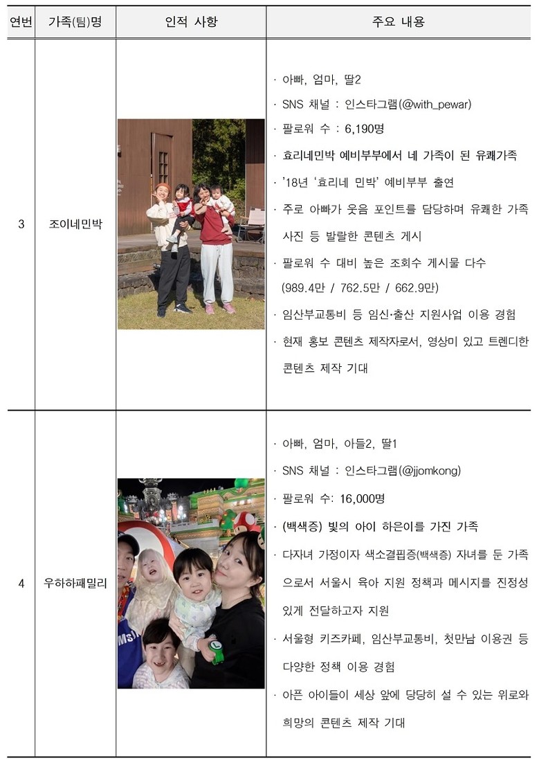 선정된 가족은 ▴인기 가수(레이디제인) 출신이자 늦은 나이에 어렵게 자녀를 출산해 난임부부에게 희망이 되고자 하는 ‘반짝반짝 우주별’ 가족 ▴아이와 함께 운동을 즐기며 몸과 마음이 건강한 육아를 꿈꾸는 ‘베이비하이커’ 가족 ▴효리네 민박 예비부부로 출연해 어느덧 단란한 네 가족을 이룬 ‘조이네민박’ 가족 ▴백색증을 앓고 있는 막내와 든든한 두 오빠의 삼남매 일상을 재미있게 소개하는 ‘우하하패밀리’ 가족 ▴네 자녀와의 일상을 고단함이 아닌 행복으로 그려내는 ‘귭리로루’ 가족 ▴800g 이른둥이 자녀의 양육방법 등을 소개할 ‘라이징썬호우’ 가족 ▴바쁘고 정신없는 육아 중에도 멋을 잃지 않는 ‘걸리버패밀리’ 가족 ▴최신 트렌드에 맞는 콘텐츠를 통해 다양한 육아 정보를 공유할 ‘하뚱이네’ 가족 등 팔인팔색의 매력이 돋보인다.