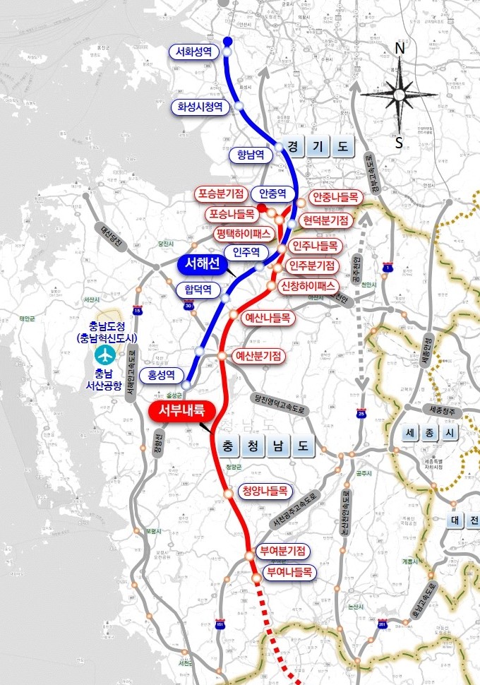 서부고속도 내에 설치하는 나들목은 부여, 청양, 예산 하이패스, 예산, 아산 신창 하이패스, 아산 인주, 평택 안중 등이다.