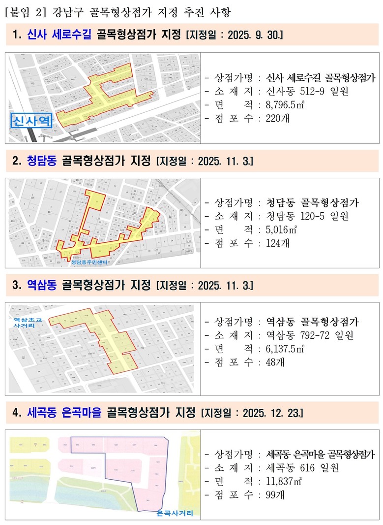 조성명 강남구청장은 “골목형 상점가 지정이 소상공인의 경쟁력을 높이고 지역 상권에 활력을 더하는 계기가 되길 바란다”며 “앞으로도 현장 여건에 맞는 상권을 발굴하고 맞춤형 지원을 강화해 골목경제를 체계적으로 활성화해 나가겠다”고 말했다.
