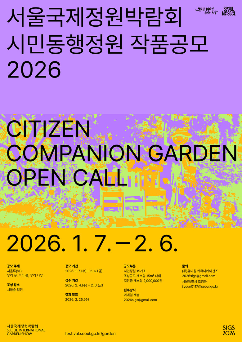 서울시는 창의적인 정원 디자인 발굴과 정원문화 확산을 위해 이달 7일(수)부터 다음달 6일(금)까지 「2026 서울국제정원박람회」 학생동행정원(이하 학생정원) 및 시민동행정원(이하 시민정원) 작품공모를 진행한다고 밝혔다.