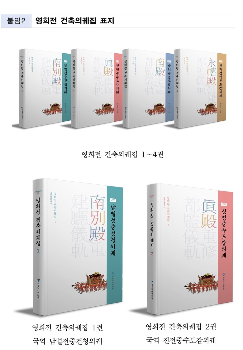 ‘영희전 건축의궤집’ 1~4권은 서울역사편찬원 누리집에서 전자책으로 무료 열람할 수 있으며 구매를 원하는 시민은 서울책방(시민청 지하1층, store.seoul.go.kr)에서 구매할 수 있으며, 12월 중 서울시 공공도서관에도 배포될 예정이다.