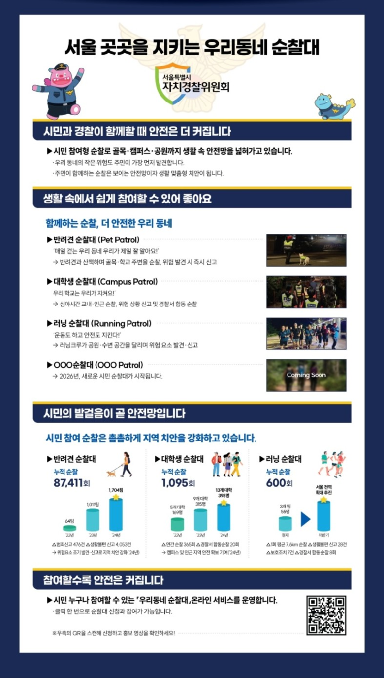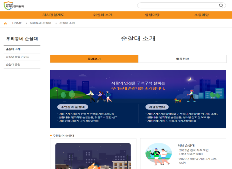 ‘우리동네 순찰대’는 반려견 순찰대, 러닝 순찰대, 자율방범대 등 주민참여 순찰대의 활동 현황과 신청 안내, 활동가이드, 우수사례 게시.추천 기능을 통합한 온라인 플랫폼으로서 시민이 참여형 치안 활동을 보다 쉽게 이해하고 참여할 수 있도록 구성됐다.