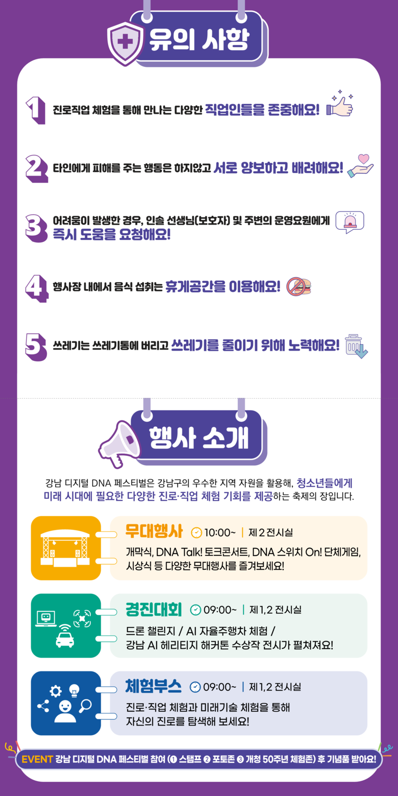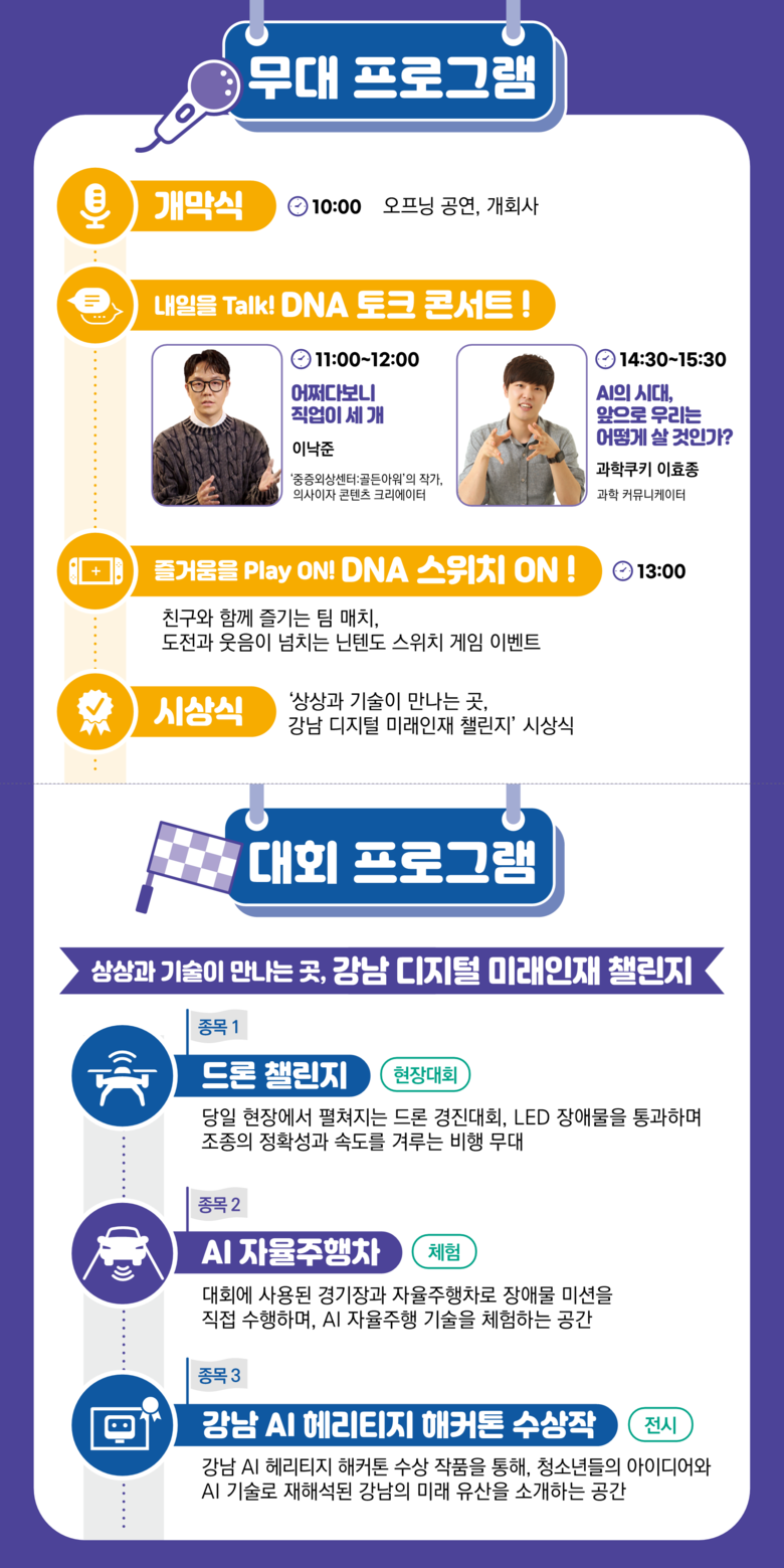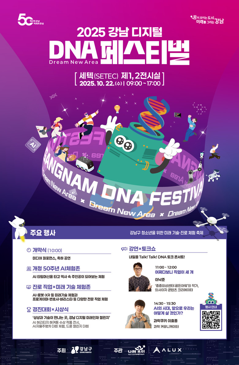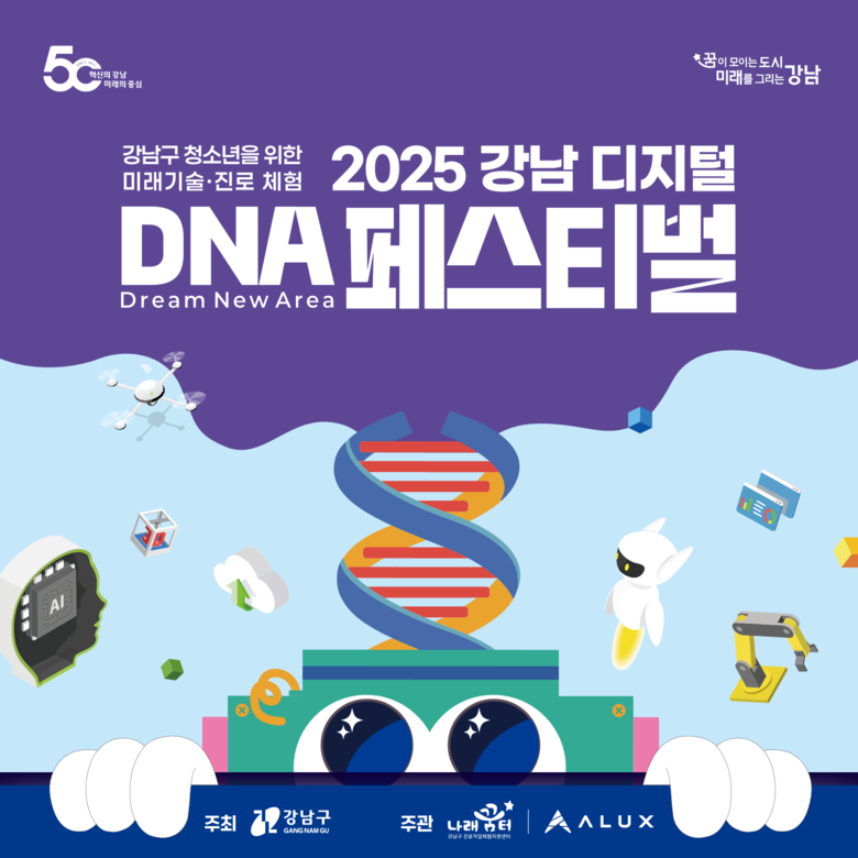 - ‘50년의 역사 위에, 청소년과 함께 미래를 그리는 강남’이라는 교육 비전 담은 축제 - [강남구 세계타임즈=이장성 기자] 꿈이 모이는 도시, 미래를 그리는 강남구(구청장 조성명)가 오는 10월 22일 오전 9시부터 오후 5시까지 세텍(SETEC) 제1‧2전시실에서 ‘2025 강남 디지털 DNA(Dream New Area) 페스티벌’을 개최한다.