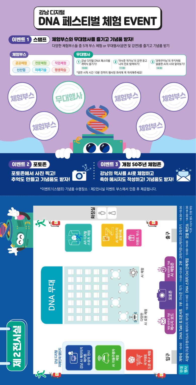 AI 체험 전시존 및 디지털 메시지존에서는 강남 아카이브 기반 AI 비디오 생성 플랫폼, 50주년 축하 메시지·미래 비전 작성 기능 등을 제공한다. 참가 학생들은 강남의 과거와 현재를 잇는 디지털 경험을 통해 강남 발전과 성장의 의미를 몸소 느낄 수 있다.