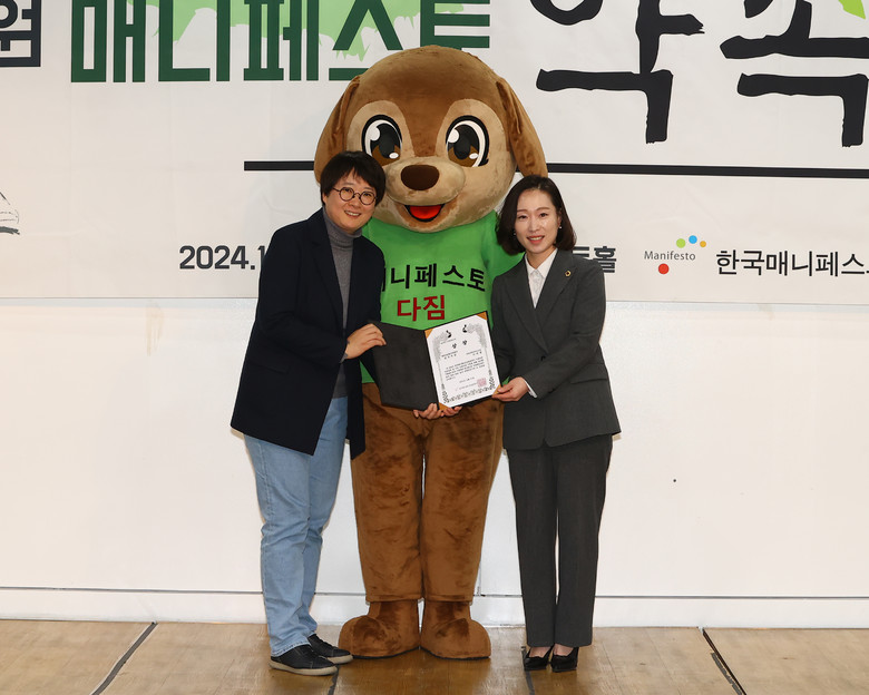 [강원도 세계타임즈=김민석 기자] 이지영 강원특별자치도의원(더불어민주당, 비례)이 27일 한국매니페스토실천본부가 주최한 '2024 지방의원 매니페스토 약속대상' 시상식에서 좋은조례 분야 최우수상을 수상했다.