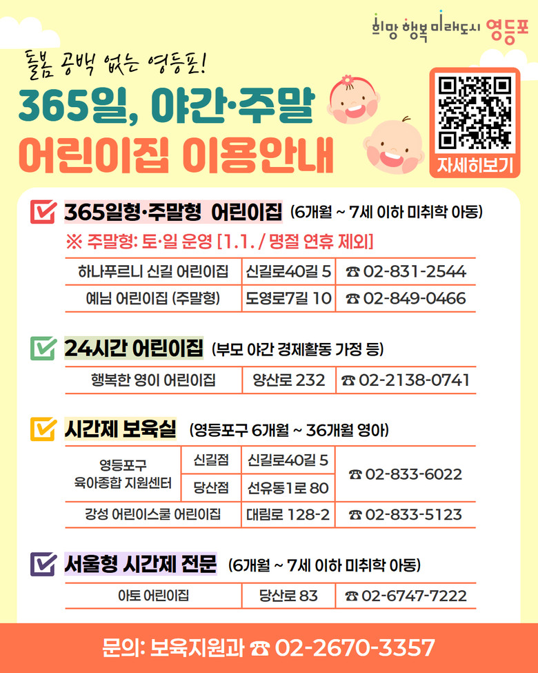 또한 구는 ‘24시간 어린이집’을 함께 운영하고 있다. 영등포동에 위치한 행복한 영이 어린이집은 오전 7시 30분부터 다음 날 오전 7시 30분까지 보육 서비스를 제공하며, 불가피하게 기존 보육시간 내 귀가가 어려운 아동을 대상으로 주간 보육과 야간 보육을 함께 지원한다.