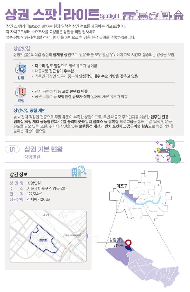 ‘현장밀착 상권분석’에서는 자치구별 주요 상권의 현장을 직접 조사해 실제 영업환경, 소비패턴, 유동인구 변화 등 기존 통계로는 파악하기 어려운 생활권 단위의 상권 특성을 정밀하게 분석했다.