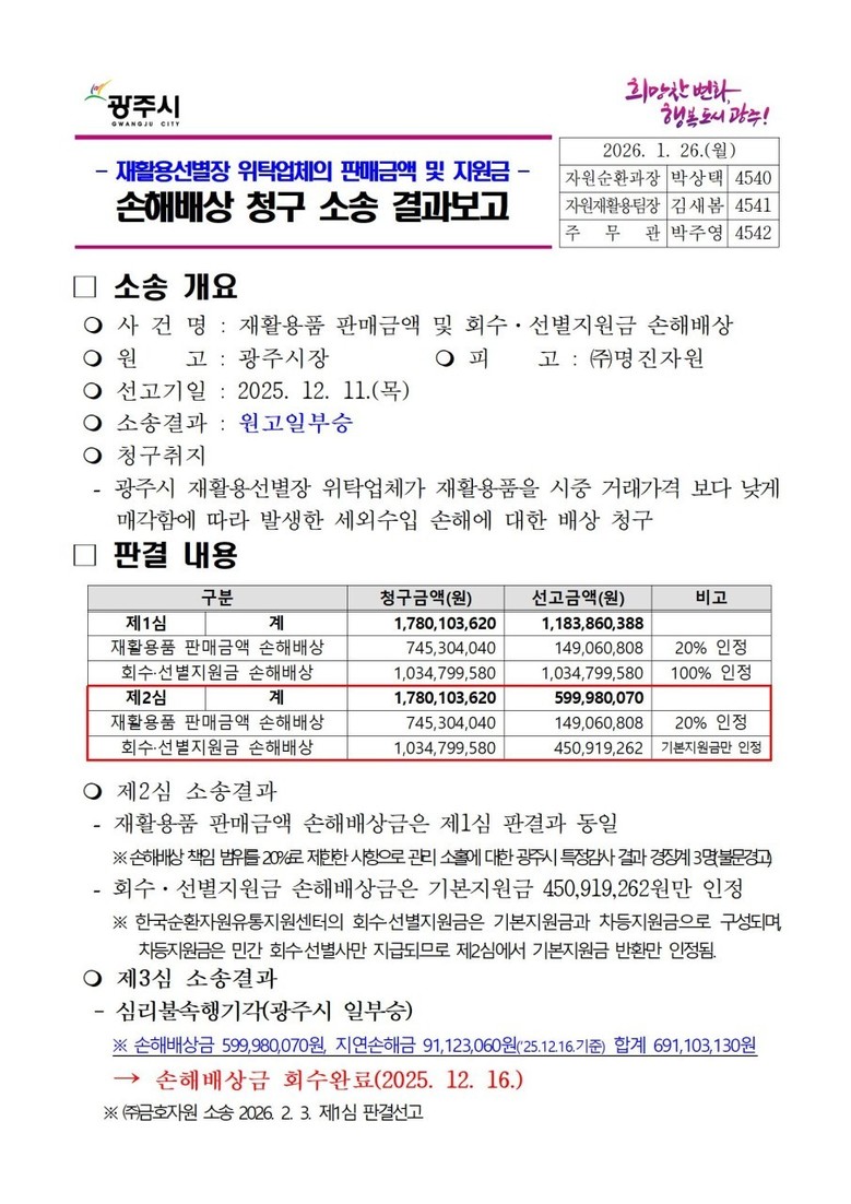 이번 판결로 광주시는 손해배상금 5억9,998만 원과 지연손해금 9,112만 원 등 총 6억9,110만 원을 최종 회수했으며, 해당 금액은 2025년 12월 16일 전액 환수 완료됐다.