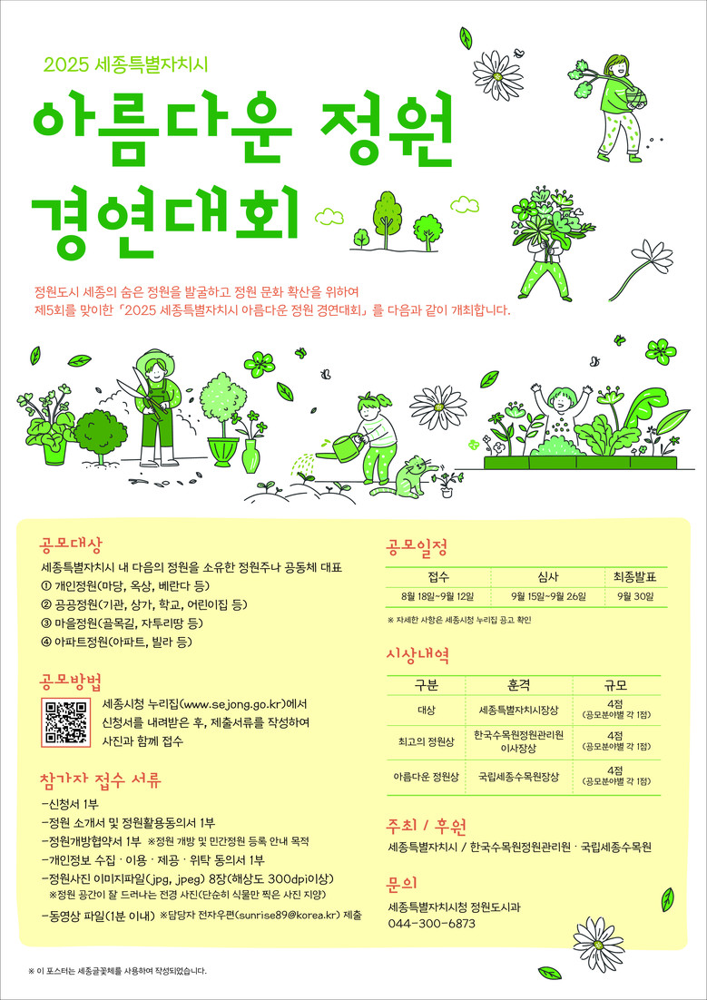 정원을 가꾸는 세종시민이라면 누구나 참여할 수 있으며 신청은 오는 8월 18일부터 9월 12일까지 시 누리집(www.sejong.go.kr)을 통해 하면 된다.