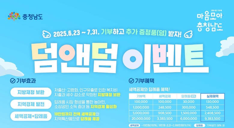 [충남 세계타임즈=이현진 기자] 충남도는 오는 23일부터 7월 31일까지 고향사랑기부 시 제공되는 답례품에 증정품을 추가로 제공하는 덤앤덤 이벤트를 진행한다고 18일 밝혔다.