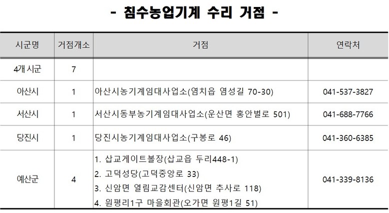 각 기관은 수리 인력과 농업기계 순회교육차량, 수리 장비 등을 피해 지역에 마련된 거점에 파견해 농업기계 2100여 대에 대한 긴급점검과 정비를 실시할 예정이다.