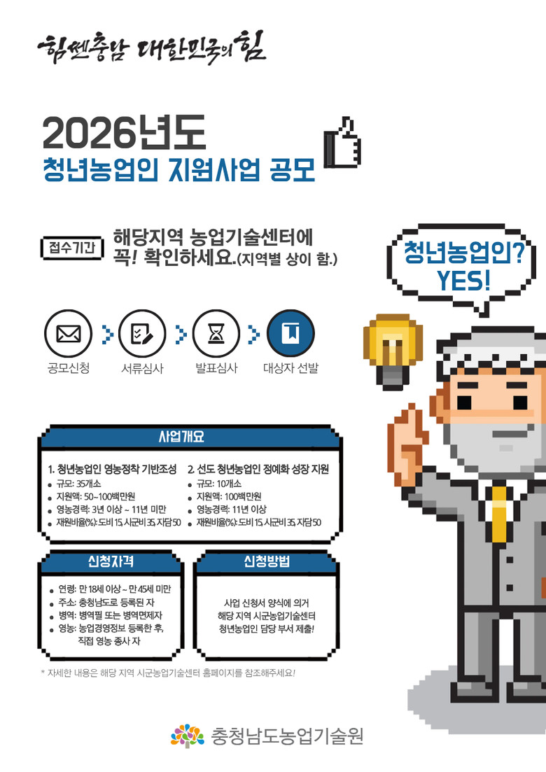도 농업기술원 관계자는 “이번 사업을 통해 청년농업인의 창농 기반을 확립하고, 충남 농업의 지속가능성을 높이겠다”며, “역량과 열정을 갖춘 청년농업인의 적극적인 참여를 기대한다”고 말했다.
