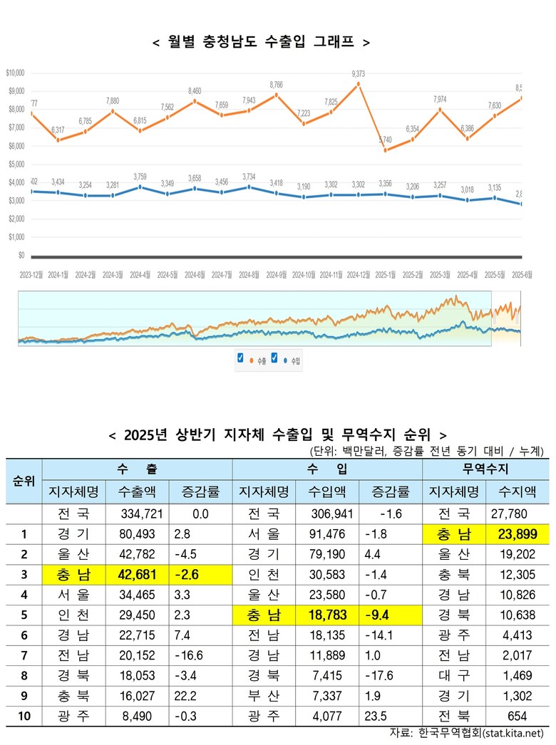 도는 31일 ‘2025년 상반기 수출입 실적’을 통해 수출 427억 달러, 수입 188억 달러를 기록해 무역수지 239억 달러 흑자를 달성해 전국 17개 시도 중 무역수지 1위를 기록했다고 밝혔다.