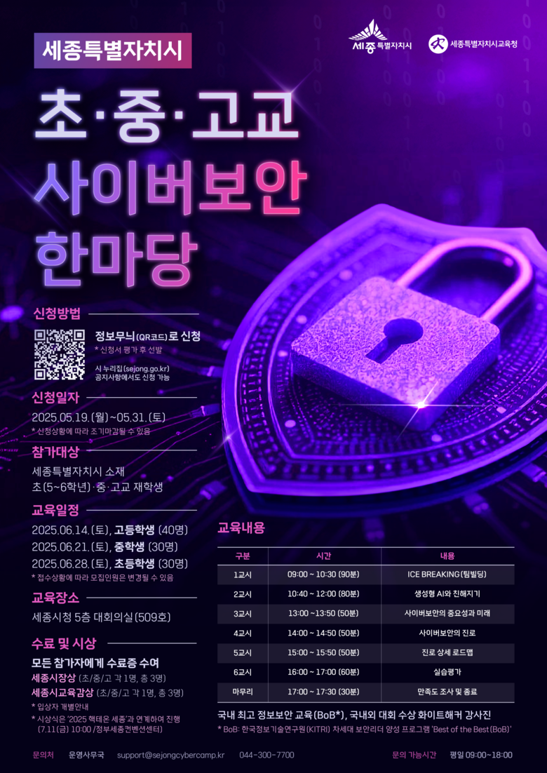 - 5월 19~31일 신청 접수…수료증 발급·세종시장상 등 수여 - [세종 세계타임즈=이채봉 기자] 세종특별자치시(시장 최민호)가 오는 6월 관내 청소년을 대상으로 열리는 ‘초·중·고교 사이버보안 한마당’의 참가 신청을 5월 19일부터 31일까지 받는다.