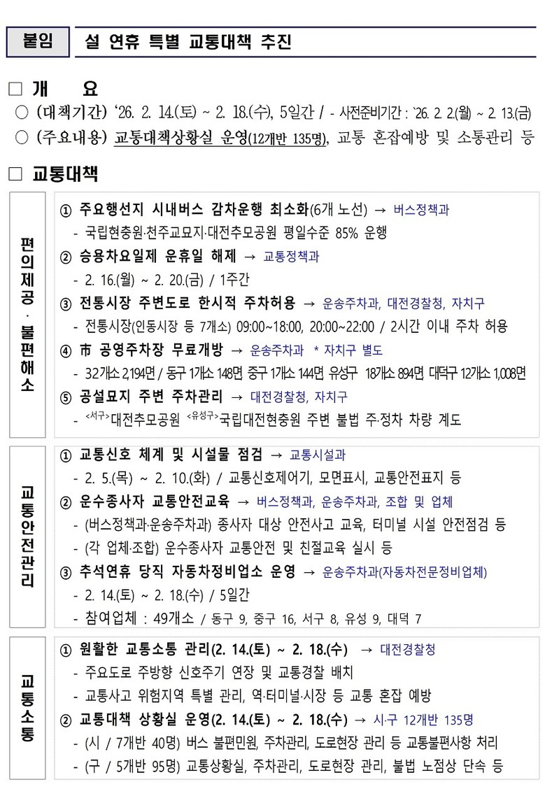[대전 세계타임즈=이채봉 기자] 대전시는 설 연휴 기간 시민과 귀성객의 이동 편의를 높이고 교통 흐름을 확보하기 위해 ‘설 연휴 특별교통대책’을 추진한다.