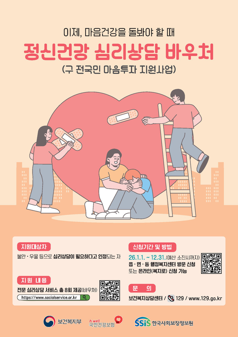 신청은 예산 소진 시까지 연중 가능하며, 신분증과 관련 증빙서류를 지참해 거주지 동주민센터를 방문하거나, 만 19세 이상 성인은 ‘복지로’ 누리집을 통해 온라인 신청할 수 있다. 선정 후에는 주소지와 관계없이 원하는 제공기관을 선택해 상담을 받을 수 있다.