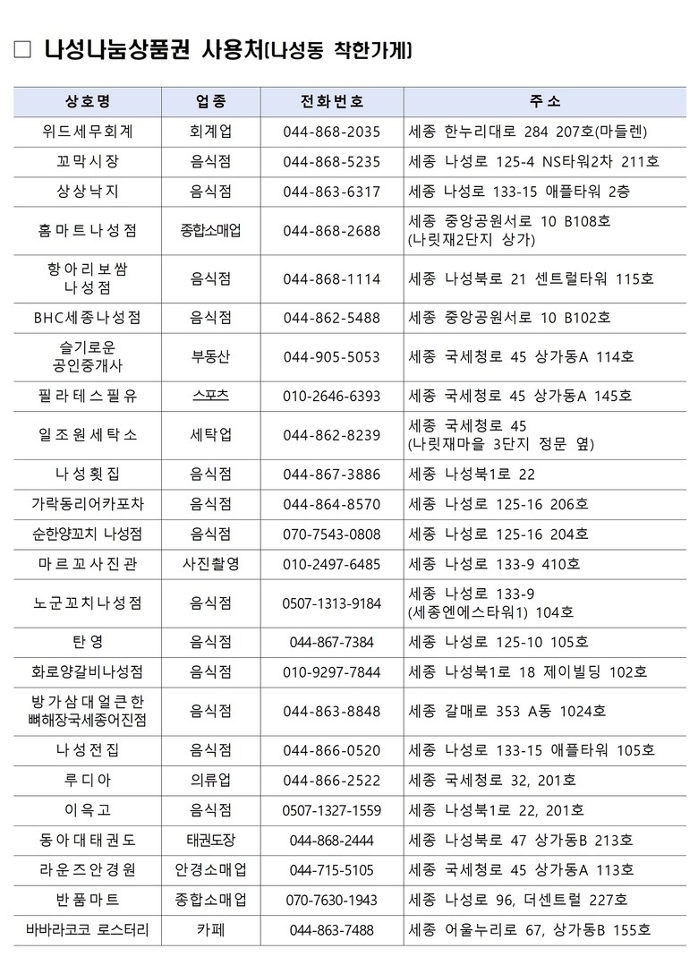 나성나눔상품권은 나성동 착한가게 24곳에서 사용할 수 있다.