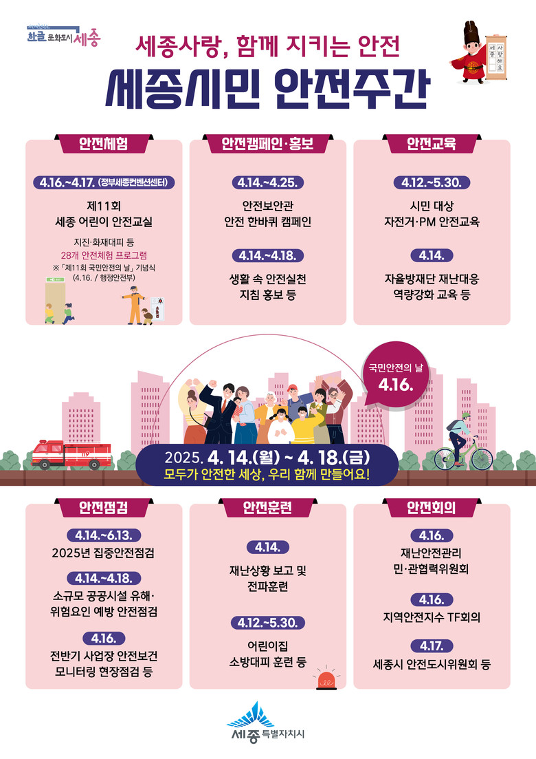 이에 따라 이 기간 ‘세종사랑, 함께 지키는 안전’을 주제로 세종 전역에서 안전 관련 체험, 점검, 캠페인 등 다양한 프로그램이 동시에 진행될 예정이다.