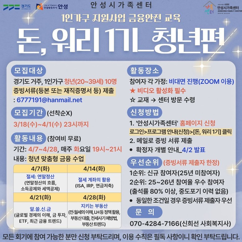 안성시 가족센터 임선희 센터장은 “이번 교육을 통해 청년 1인 가구들이 복잡한 금융 세상을 이해하고 실질적인 자산 관리 능력을 키우는 계기가 되길 바란다”고 전했다.