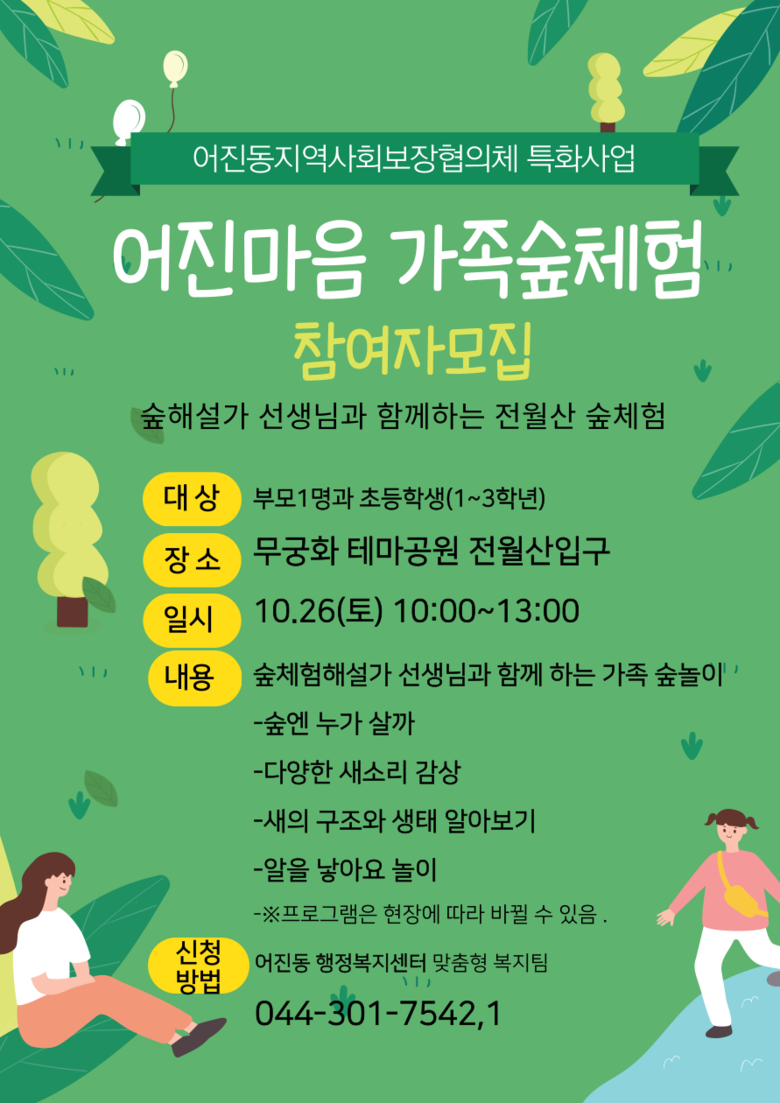 숲체험은 어진동 지사협 위원인 숲지도사의 재능기부로 이뤄진다. 올해를 시작으로 매년 봄, 가을 연 2회 시행할 예정이다.