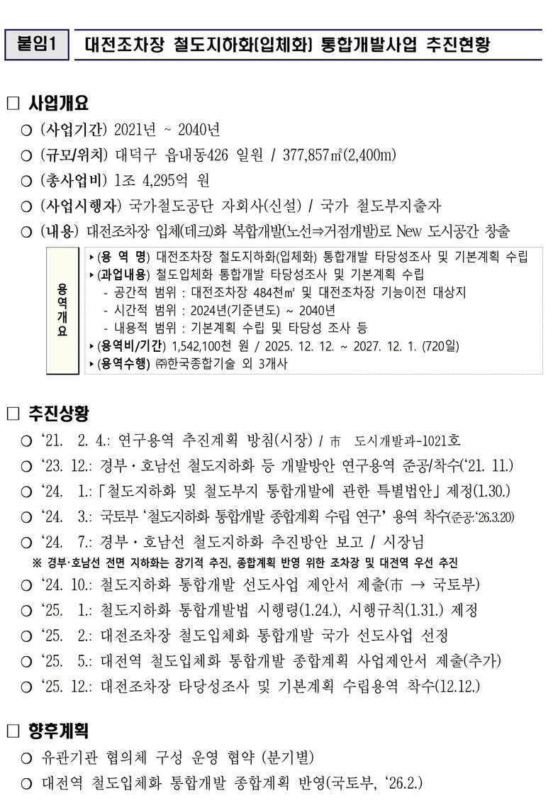 착수보고회에서는 사업의 핵심 추진 주체인 국토교통부와 대전시가 각각 철도시설 지하화와 상부 공간 개발에 대한 추진 방향을 설명하며, 향후 계획을 공유했다.