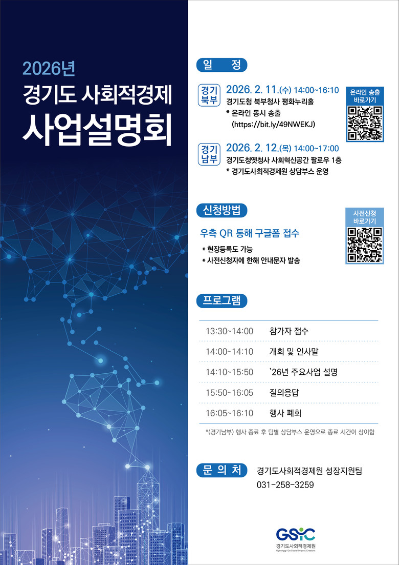 사업설명회 참여를 희망하는 경우 오는 10일까지 경기도사회적경제원 누리집(gsic.or.kr)에서 사전 신청하거나, 행사 당일 현장 등록으로 참가하면 된다. 단, 현장에서는 남·북부 권역별 각 100명씩 선착순으로 입장 가능하다.