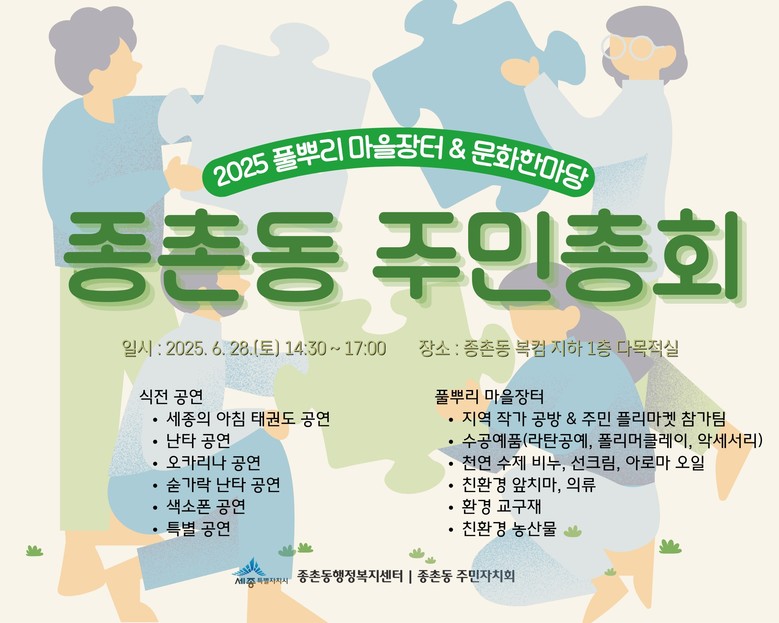행사에 대한 자세한 사항은 종촌동 행정복지센터(☎044-301-6412)로 문의하면 된다.