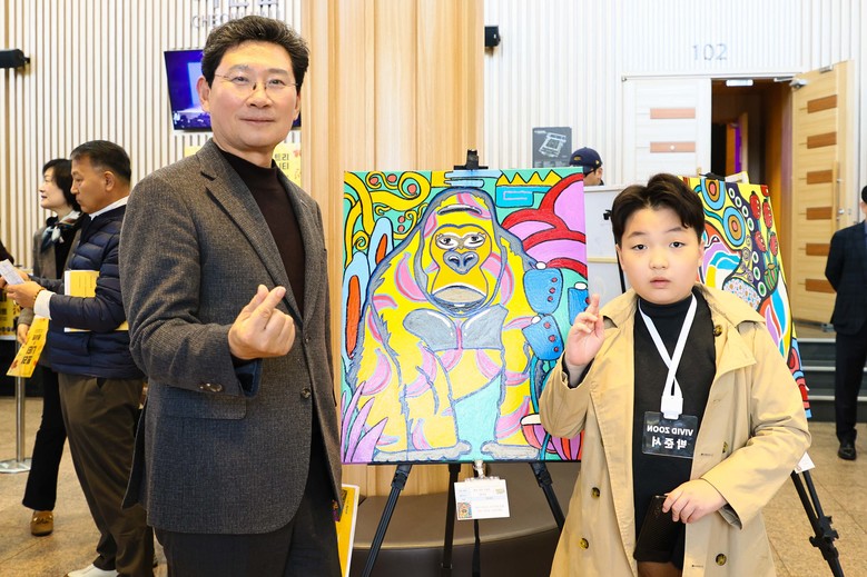 | ▲ 이상일 용인특례시장은 2일 사단법인 용인문화시민광장 4주년 기념 연주회에 참석해 장애아동화가 박준서 작품을 관람했다 |