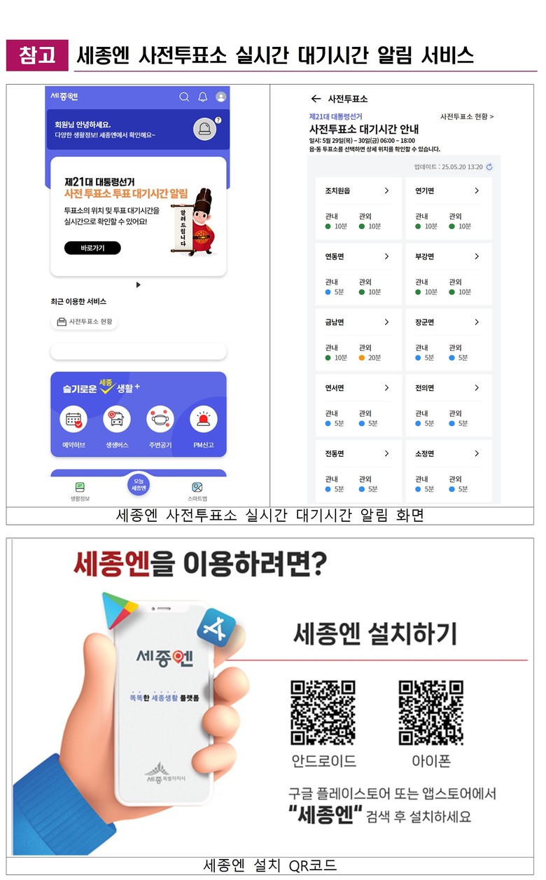 시는 시민들이 편리하고 신속하게 투표권을 행사할 수 있도록 ‘세종엔’ 앱을 통해 24개 읍면동 사전투표소의 실시간 혼잡도와 투표소 길안내 서비스를 제공한다.