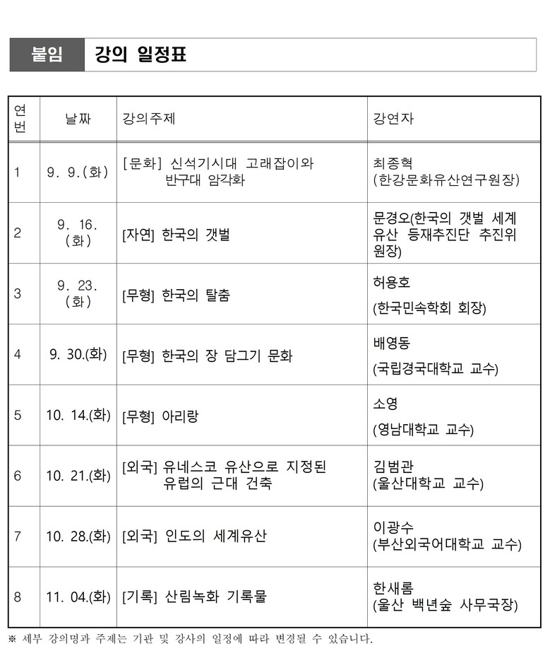 주요 강의 일정은 9월의 경우 ▲9월 9일 최종혁 한강문화유산연구원장의‘신석기시대 고래잡이와 반구대 암각화’ ▲9월 16일 문경오 전 한국의 갯벌 세계유산 등재추진단 추진위원장의‘한국의 갯벌' ▲9월 23일 허용호 한국민속학회 회장의‘한국의 탈춤’ ▲9월 30일 배영동 국립경국대학교 교수의‘한국의 장담그기 문화’강의가 진행된다.