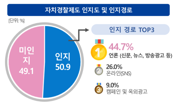 설문조사 결과, 도민의 자치경찰제 인지도는 지난해 31.9%에서 올해 50.9%로 19%포인트 상승해 제도에 대한 인식이 크게 확산한 것으로 나타났다.