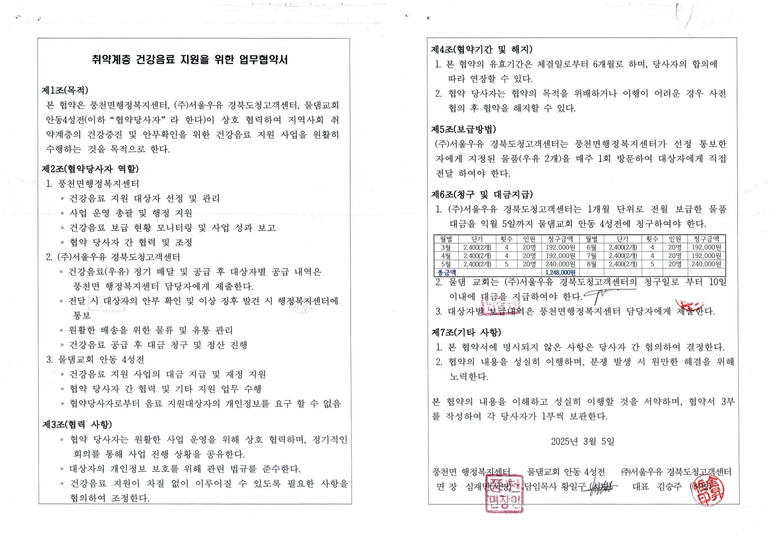 이번 사업은 물댐교회의 재정적 지원을 바탕으로 6개월간 20가구를 대상으로 매주 1회, 우유 2개를 제공하는 내용으로 진행되며, 단순한 물품 지원을 넘어 정기 방문을 통한 안부 확인과 돌봄까지 이뤄질 예정 으로 지역사회 내 복지 안전망 강화에도 기여할 것으로 기대된다.