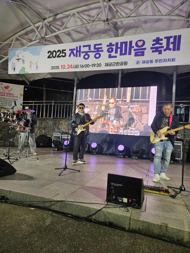 무대에서는 주민 화합을 위한 다채로운 공연이 펼쳐졌다. 먼저 재궁동 사생대회 시상을 통해 지역 어린이들의 노력을 격려했으며, 이어 어린이 난타, 줌바댄스, 통기타 연주, 가곡, 장구난타 등 주민자치 프로그램 참여자들과 공연자들이 그동안 갈고닦은 실력을 유감없이 선보였다. 특히, 초청된 밴드 건아들의 특별 공연은 축제의 분위기를 최고조로 끌어올리며 모든 세대가 함께 박수 치고 노래하는 화합의 장을 만들었다.